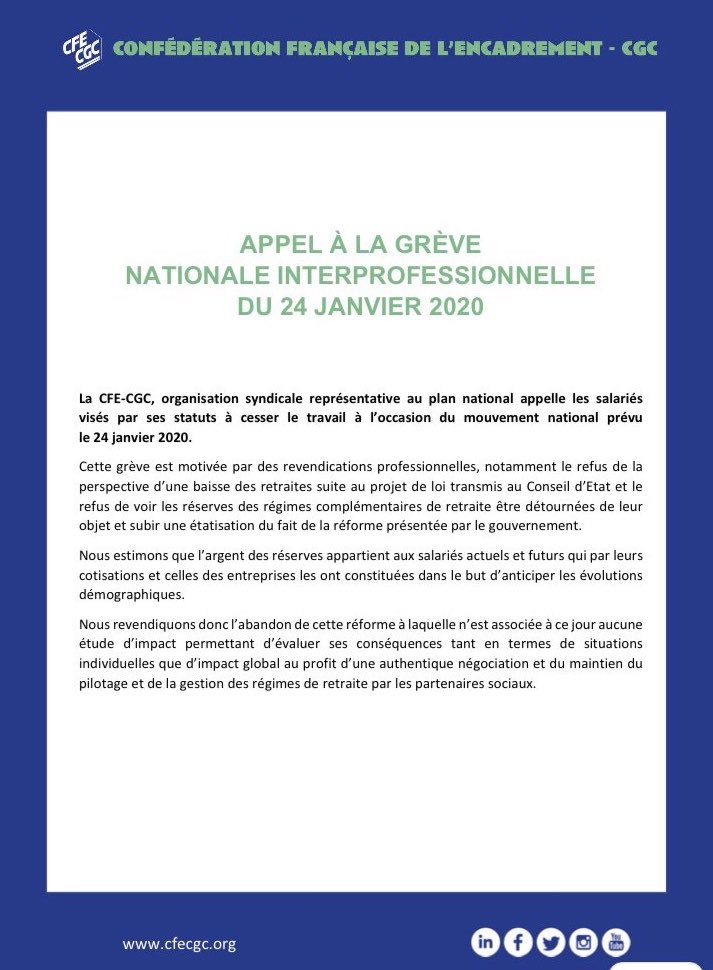 DetailsLa CFE-CGC, organisation syndicale représentative au plan national appelle les salariés visés par ses statuts à cesser le travail à l’occasion du mouvement national prévu le 17 décembre 2019. Powered by WPeMatico