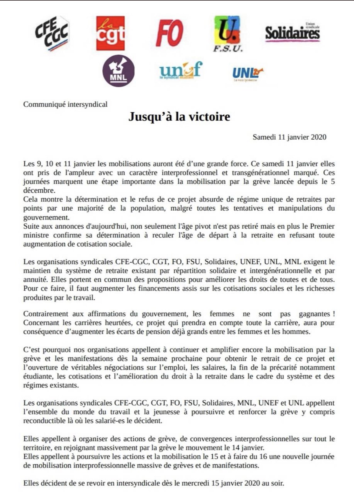 Appel à la grève nationale interprofessionnelle du 16 Janvier 2020