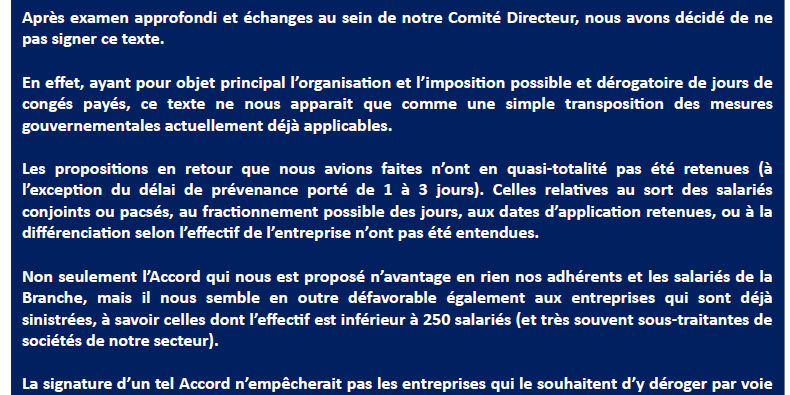 COMMUNICATION FIECI – NON SIGNATURE D’UN PROJET D’ACCORD SUR LES CONGÉS PAYÉS
